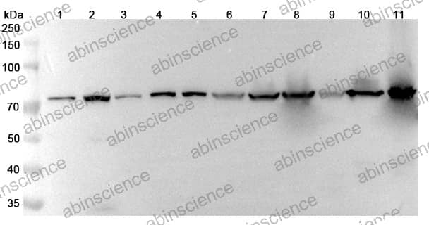 Western blot analysis was performed using anti-ANXA6 polyclonal antibody at 1μg/ml on various samples. Lane 1: Jurkat cell lysate Lane 2: Hela cell lysate Lane 3: A549 cell lysate Lane 4: C2C12 cell lysate Lane 5: PC12 cell lysate Lane 6: Mouse kidney lysate Lane 7: Mouse heart lysate Lane 8: Mouse liver lysate Lane 9: Rat kidney lysate Lane 10: Rat heart lysate