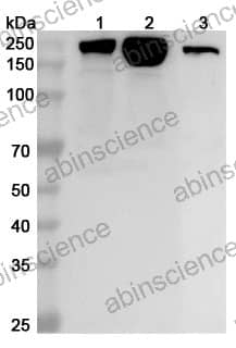 Western blot analysis was performed using anti-MYH7 polyclonal antibody at 1ug/mL on various samples. Lane 1: Mouse heart lysate Lane 2: Mouse skeletal muscle lysate Lane 3: Rat skeletal muscle lysate