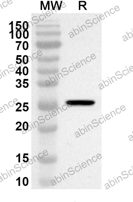 Western blot analysis was performed using anti-CD102/ICAM2 polyclonal antibody at 1ug/mL on recombinant CD102/ICAM2 (Catalog No. HY351012). |