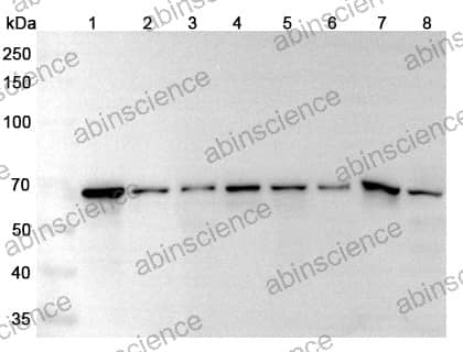 Western blot analysis was performed using anti-STIP1 polyclonal antibody at 1μg/ml on various samples. Lane 1: BXPC3 cell lysate Lane 2: SKOV3 cell lysate Lane 3: Jurkat cell lysate Lane 4: HepG2 cell lysate Lane 5: Lncap cell lysate Lane 6: Jurkat cell lysate Lane 7: K562 cell lysate Lane 8: NIH3T3 cell lysate