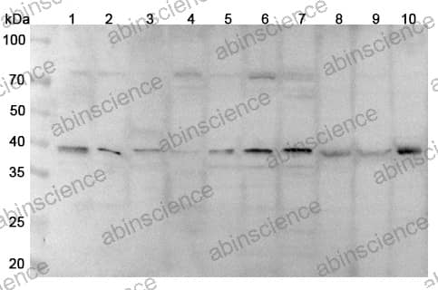 Western blot analysis was performed using anti-CD326 polyclonal antibody at 1μg/ml on various samples. Lane 1: U937 cell lysate Lane 2: Daudi cell lysate Lane 3: Raji cell lysate Lane 4: RAW264.7 cell lysate Lane 5: K562 cell lysate Lane 6: 293T cell lysate Lane 7: Rat colon lysate Lane 8: Rat liver lysate Lane 9: Rat lung lysate