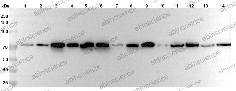 Western blot analysis was performed using anti-HSPA1L polyclonal antibody at 1μg/ml on various samples. Lane 1: PC12 cell lysate Lane 2: HepG2 cell lysate Lane 3: Human plasma lysate Lane 4: Mouse spleen lysate Lane 5: Mouse liver lysate Lane 6: Mouse kidney lysate Lane 7: Mouse lung lysate Lane 8: Rat spleen lysate Lane 9: Rat liver lysate Lane 10: Rat kidney lysate