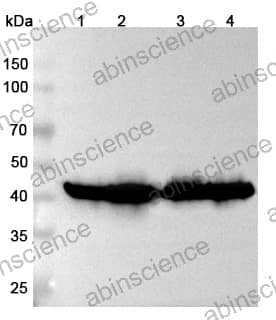Western blot analysis was performed using anti-ACAA2 polyclonal antibody at 1μg/ml on various samples. Lane 1: Mouse heart lysate Lane 2: Mouse liver lysate Lane 3: Rat heart lysate Lane 4: Rat liver lysate