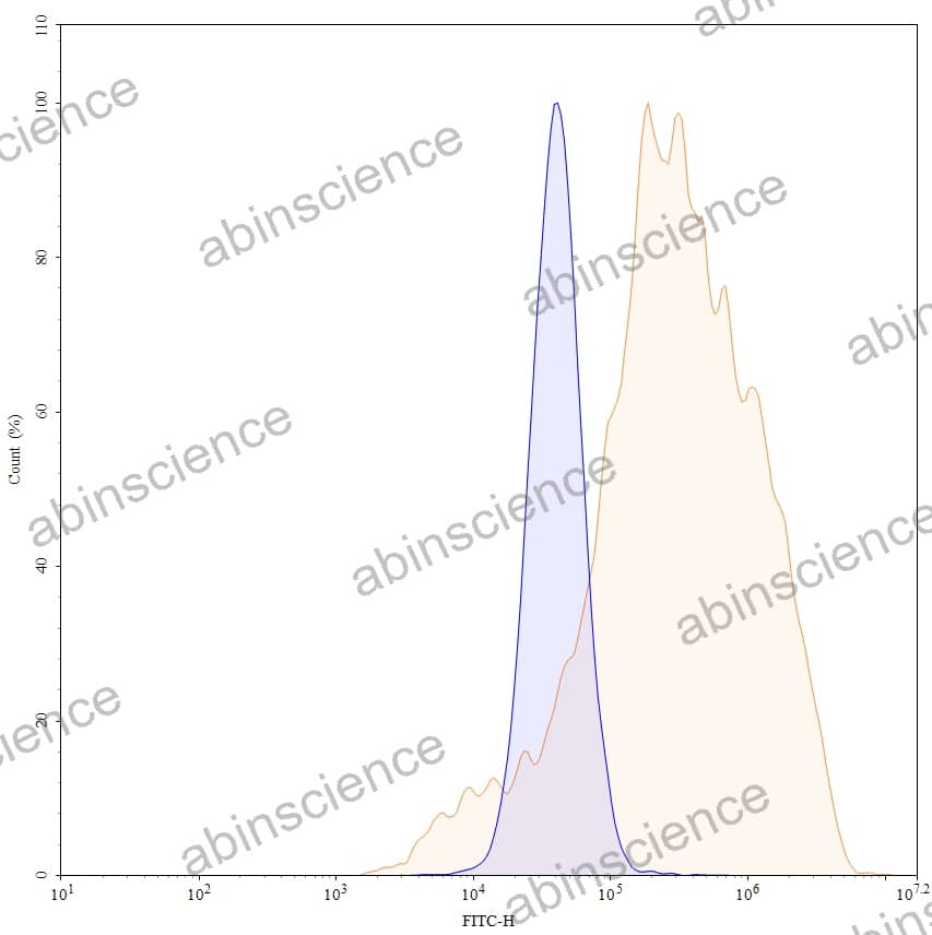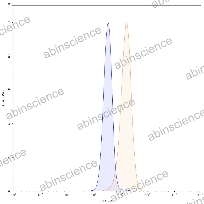 Flow-cytometry using anti-human IGFIR antibody. Untransfected cells (blue Histogram) and Transfected cells (Yellow Histogram) were stained with an anti-human IGFIR monoclonal antibody (Catalog HY353026) at a concentration of 5 µg/ml for 30 mins at RT. After washing, bound antibody was detected using a Goat Anti-Human IgG H&L Polyclonal Antibody, FITC (abinScience: HF690414) and cells analysed on a NovoCyte Flow Cytometer. |