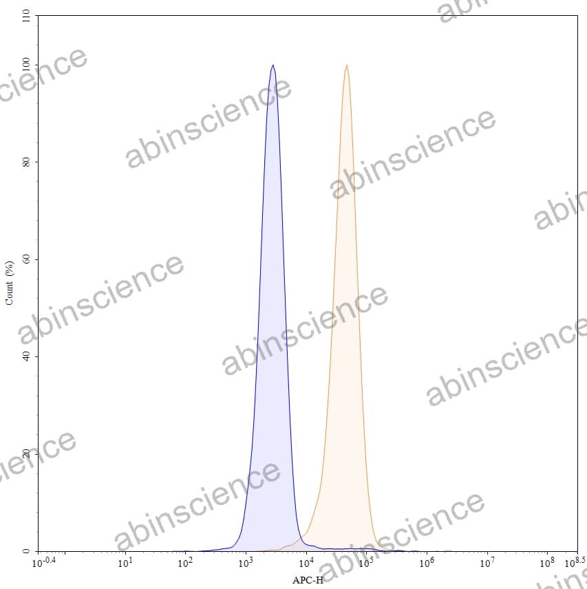 Flow-cytometry using APC anti-human CD221 antibody. Hela cells were stained with an irrelevant antibody (Blue Histogram) or an APC anti-human CD221 monoclonal antibody (Catalog: HY353026, Yellow Histogram) at a concentration of 5 µg/ml for 30 mins at RT. After washing, and cells analysed on a NovoCyte Flow Cytometer. |