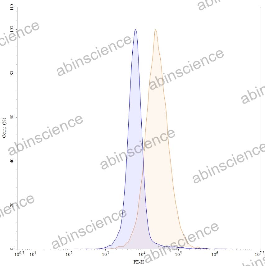 Flow-cytometry using PE anti-human CD221 antibody. Hela cells were stained with an irrelevant antibody (Blue Histogram) or an PE anti-human CD221 monoclonal antibody (Catalog: HY353026, Yellow Histogram) at a concentration of 5 µg/ml for 30 mins at RT. After washing, and cells analysed on a NovoCyte Flow Cytometer. |
