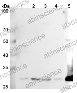 Western blot analysis was performed using anti-GCLM polyclonal antibody at 1μg/ml on various samples. Lane 1: K562 cell lysate Lane 2: NICH460 cell lysate Lane 3: Mouse liver lysate Lane 4: Mouse spleen lysate Lane 5: Rat kidney lysate